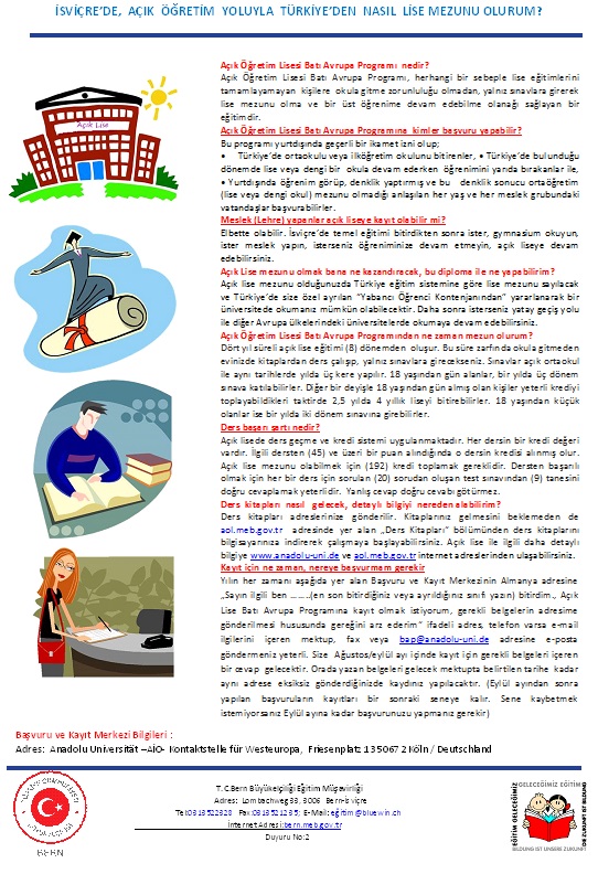 Bern Büyükelçiliği Eğitim Müşavirliği’nin açık lise ve açık orta okul sınavlarının Bern'de yapılması isteği karşılık buldu. 2013-2104 eğitim öğretim yılından itibaren bu sınavlar artık Eğitim Müşavirliğimiz gözetiminde Bern Üniversitesinde yapılacak. Bu sayede bundan önceki yıllarda sınav için Almanya'ya gitmek zorunda kalan vatandaşlarımız artık sınavlara İsviçre'de girecekler. 2013-2014 yılı için sınav tarihleri;