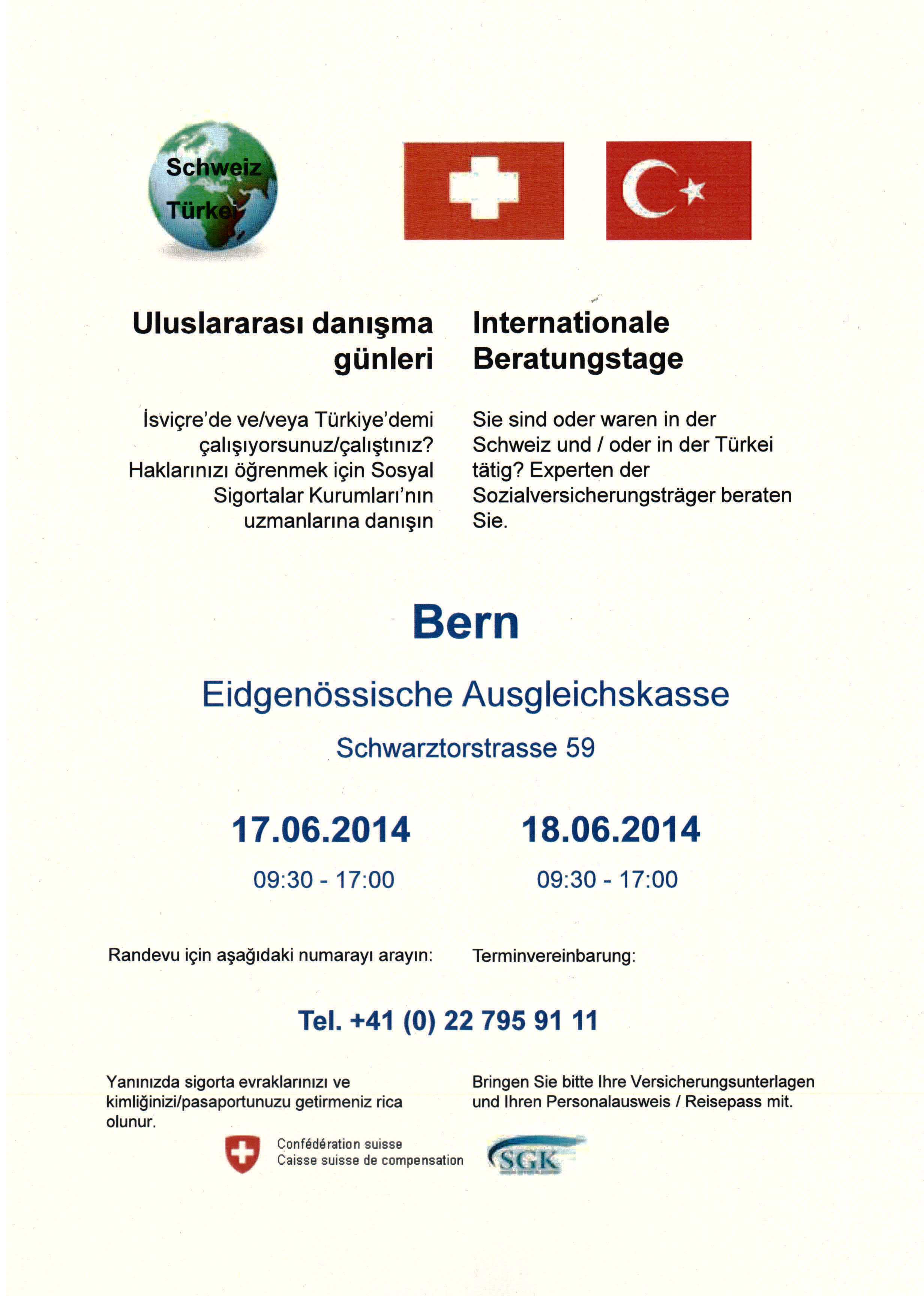 Türk Sosyal Güvenlik Kurumu ile İsviçre Sigorta Kurumunca, 17-18 Haziran 2014 tarihlerinde Bern’de “Danışma Günleri” etkinliği yapılacaktır.
