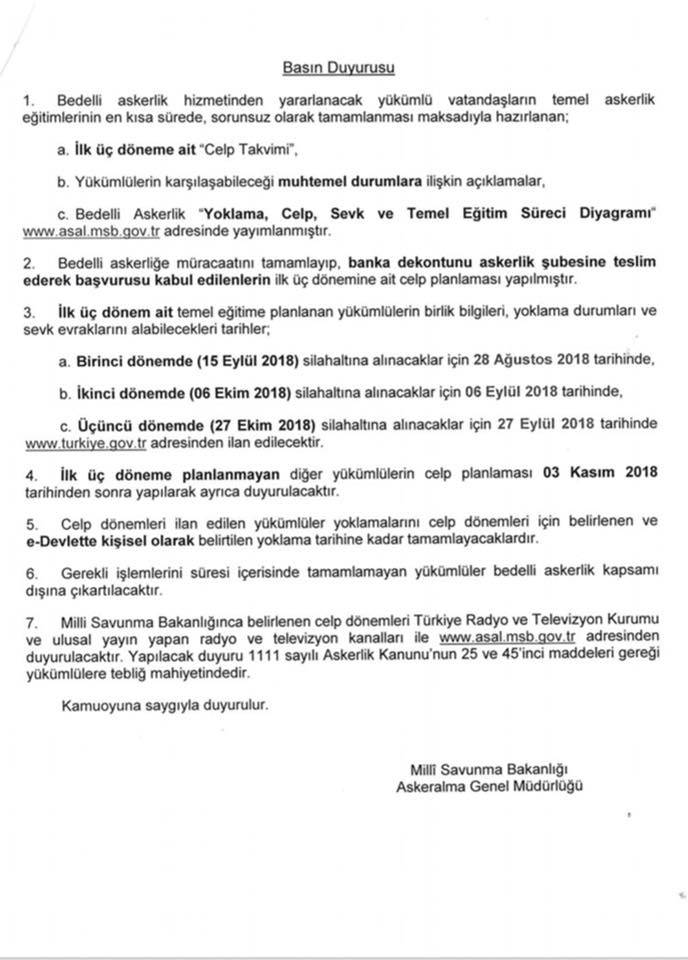 Milli Savunma Bakanlığı’nın bedelli askerlik hizmetine ilişkin sevk ve celp duyurusu ekte yer almaktadır.