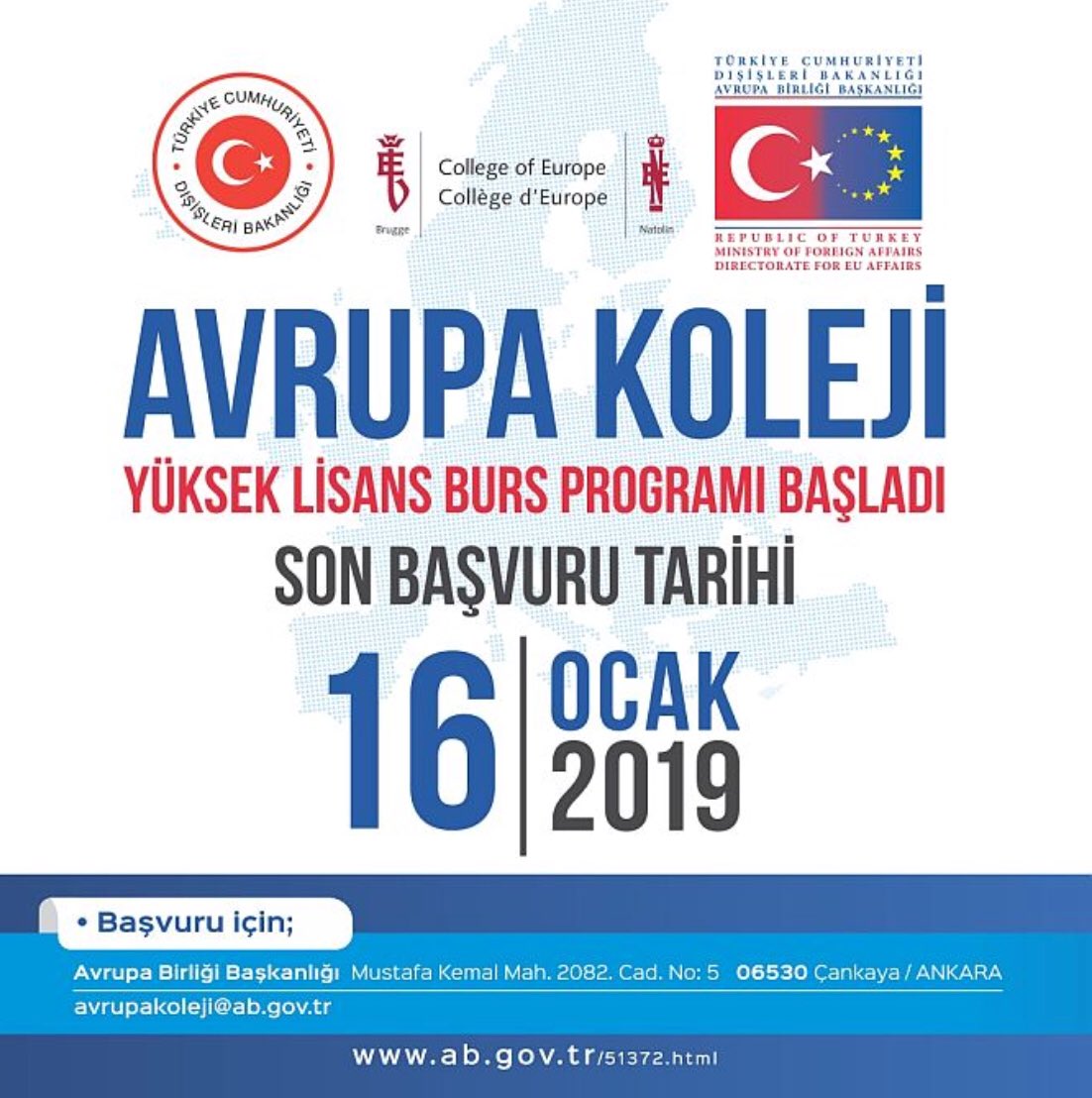 Avrupa Birliği Başkanlığı'nın, Avrupa Koleji Yüksek Lisans Burs Programı 2019-2020 Akademik Yılı Başvurularına(Son Başvuru Tarihi: 16 Ocak 2019) ilişkin duyurusuna aşağıdaki linkten erişilmesi mümkündür.