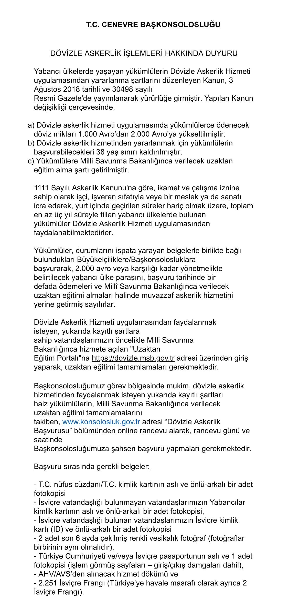 Yabancı ülkelerde yaşayan yükümlülerin Dövizle Askerlik Hizmeti uygulamasından yararlanma şartlarını düzenleyen Kanun, 3 Ağustos 2018 tarihli ve 30498 sayılı Resmi Gazete'de yayımlanarak yürürlüğe girmiştir. Yapılan Kanun değişikliği çerçevesinde,