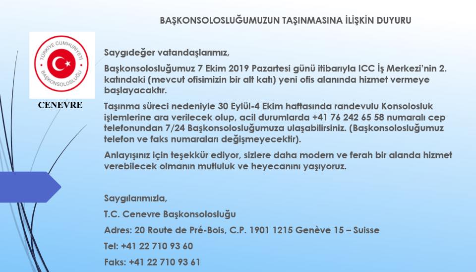 Taşınma süreci nedeniyle 30 Eylül-4 Ekim haftasında randevulu Konsolosluk işlemlerine ara verilecek olup, acil durumlarda +41 76 242 65 58