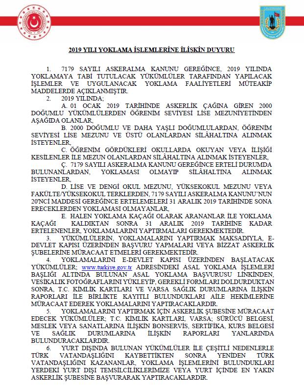 Milli Savunma Bakanlığımızın 2019 yılı yoklama işlemlerine ilişkin duyurusu ekte sunulmaktadır.