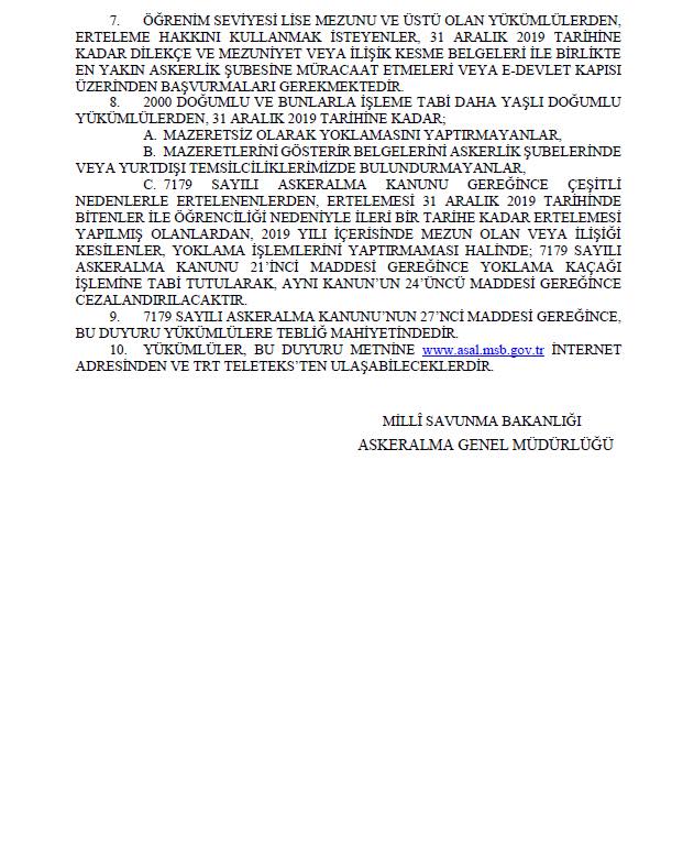 Milli Savunma Bakanlığımızın 2019 yılı yoklama işlemlerine ilişkin duyurusu
