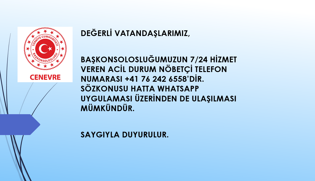 BAŞKONSOLOSLUĞUMUZUN 7/24 HİZMET VEREN ACİL DURUM NÖBETÇİ TELEFON NUMARASI +41 76 242 6558’DİR. SÖZKONUSU HATTA WHATSAPP UYGULAMASI ÜZERİNDEN DE ULAŞILMASI MÜMKÜNDÜR.
