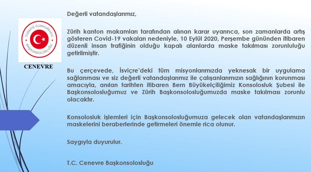 Bu çerçevede, İsviçre’deki tüm misyonlarımızda yeknesak bir uygulama sağlanması ve siz değerli vatandaşlarımız ile çalışanlarımızın sağlığının korunması amacıyla, anılan tarihten itibaren Bern Büyükelçiliğimiz Konsolosluk Şubesi ile Başkonsolosluğumuz ve Zürih Başkonsolosluğumuzda maske takılması zorunlu olacaktır.