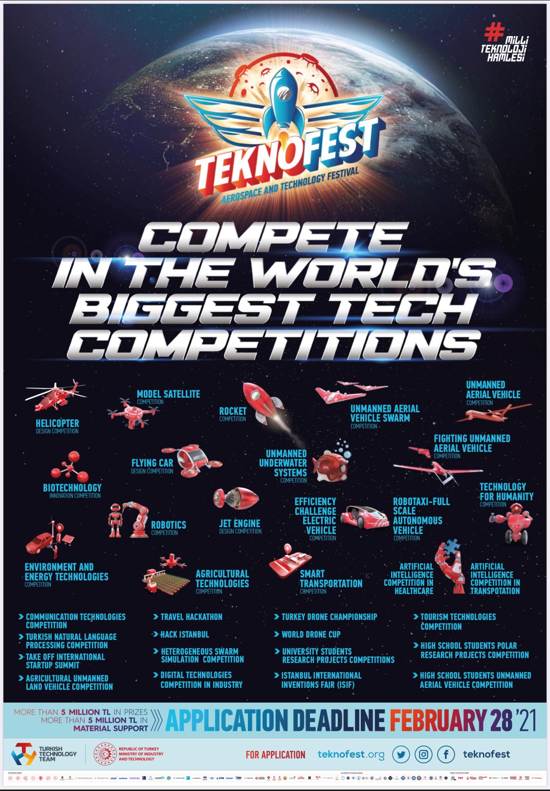 Si vous souhaitez participer au festival de l'aéronautique, de l'espace et de la technologie TEKNOFEST qui se tiendra à Istanbul du 21 au 26 septembre 2021, et vous inscrire aux concours, veuillez consulter le site web ;