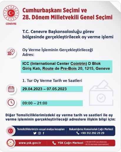 Cumhurbaşkanı Seçimi ve 28. Dönem Milletvekili Genel Seçimine ilişkin olarak Yüksek Seçim Kurulu tarafından kabul edilen Seçim Takvimi uyarınca,Yurt Dışı SeçmenKütüğü’ndekayıtlı olan vatandaşlarımız Cenevre’de29Nisan - 7 Mayıs2023tarihleri arasında Başkonsolosluğumuzun da bulunduğu ICC İş Merkezi'nde oy kullanabilecektir. Oy kullanma işlemleri anılan tarihler arasında saat 9:00'da başlayacak, saat 21:00'de sona erecektir.